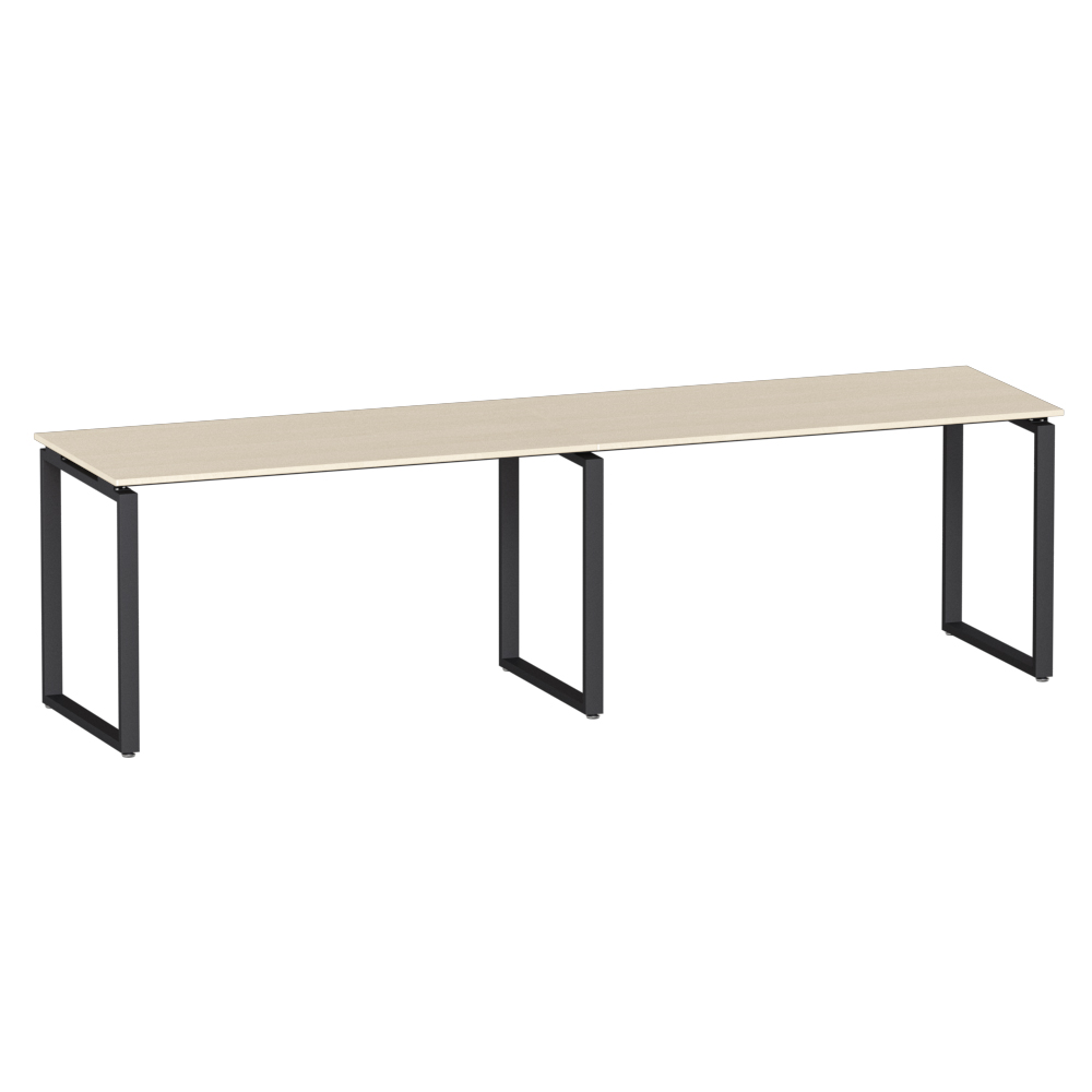 Столешница выполнена из ЛДСП толщиной 16 мм с кромкой ПВХ толщиной 2 мм. Металлический П-образный каркас изготовлен из опор сечением 50х25 мм, соединённых стальными траверсами сечением 40x20 мм. Опоры имеют регулировку по высоте для компенсации неровностей пола.