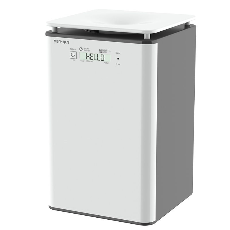 Безопасен при использовании в присутствии людей. Обеззараживание воздушного потока происходит в процессе его принудительной циркуляции через пластиковый корпус. Внутри корпуса установлена безозоновая бактерицидная лампа низкого давления мощностью 15 Вт с цоколем 2G11 марки МЕГИДЕЗ. Ультрафиолетовое излучение лампы уничтожает болезнетворные микроорганизмы, и чистый, обеззараженный воздух после циркуляции по лабиринту воздуховода возвращается в помещение.
