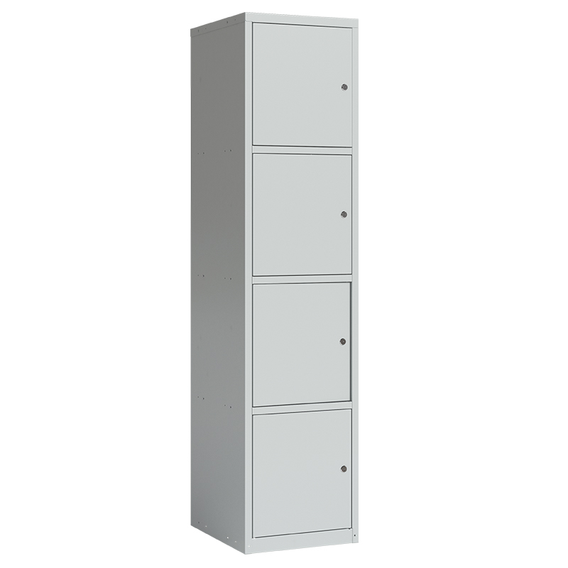 Шкаф содержит четыре отделения в форме ячеек с дверцами. Дверцы ячеек оборудованы врезными замками.