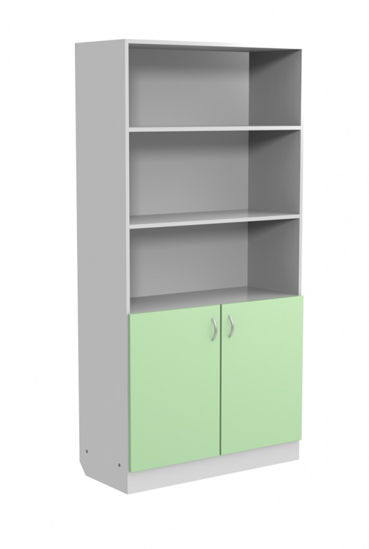 Шкаф имеет два отделения. Верхнее отделение с двумя открытыми полками. Нижнее отделение с двумя дверями и полкой.
