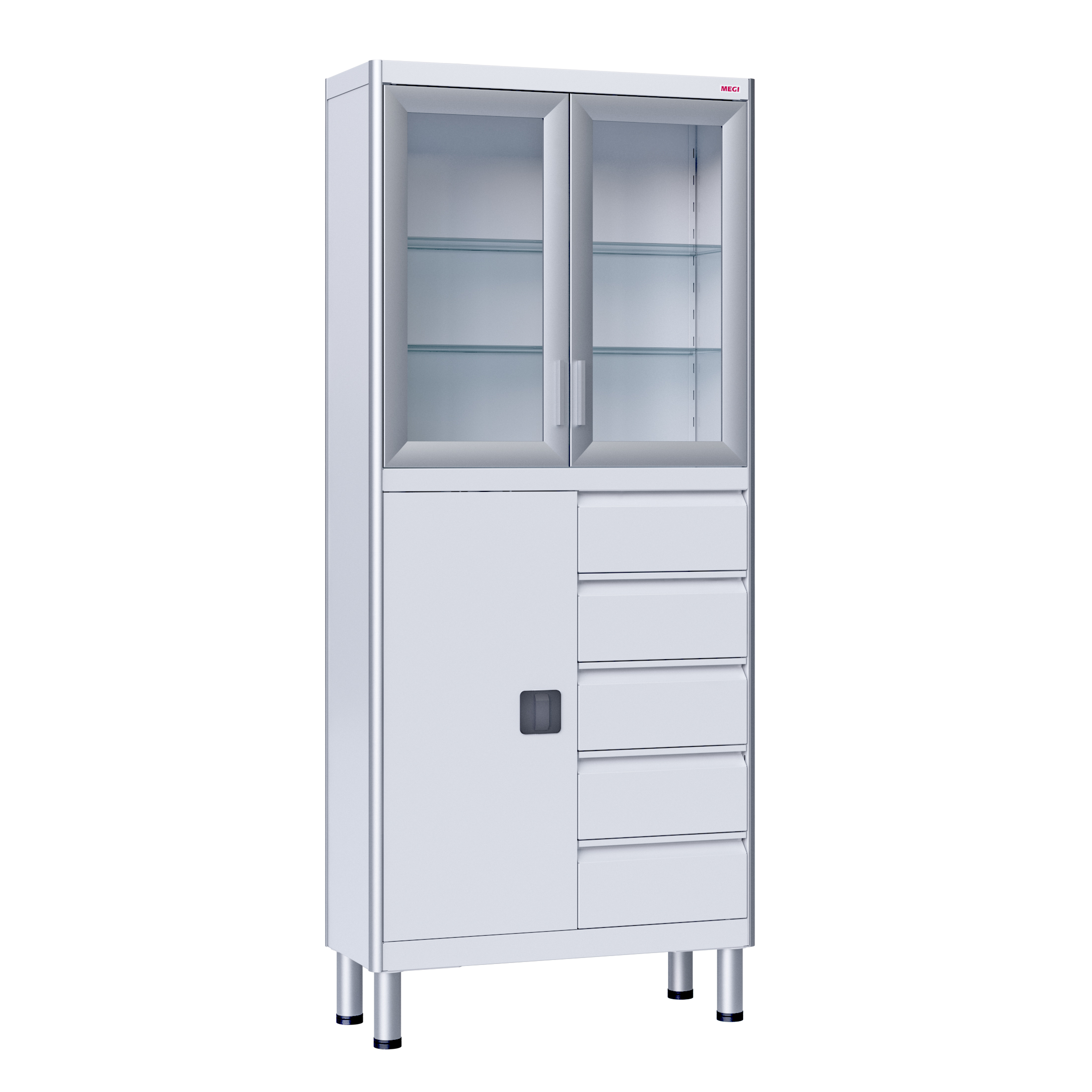 Наименование по Регистрационному удостоверению:Шкаф медицинский двухсекционный, двухстворчатый, из алюминиевого профиля и нержавеющей стали, со стеклянными полками и стеклянными дверками с окантовкой из алюминиевого профиля в верхней секции, пятью выдвижными ящиками, металлическими полками и дверкой в