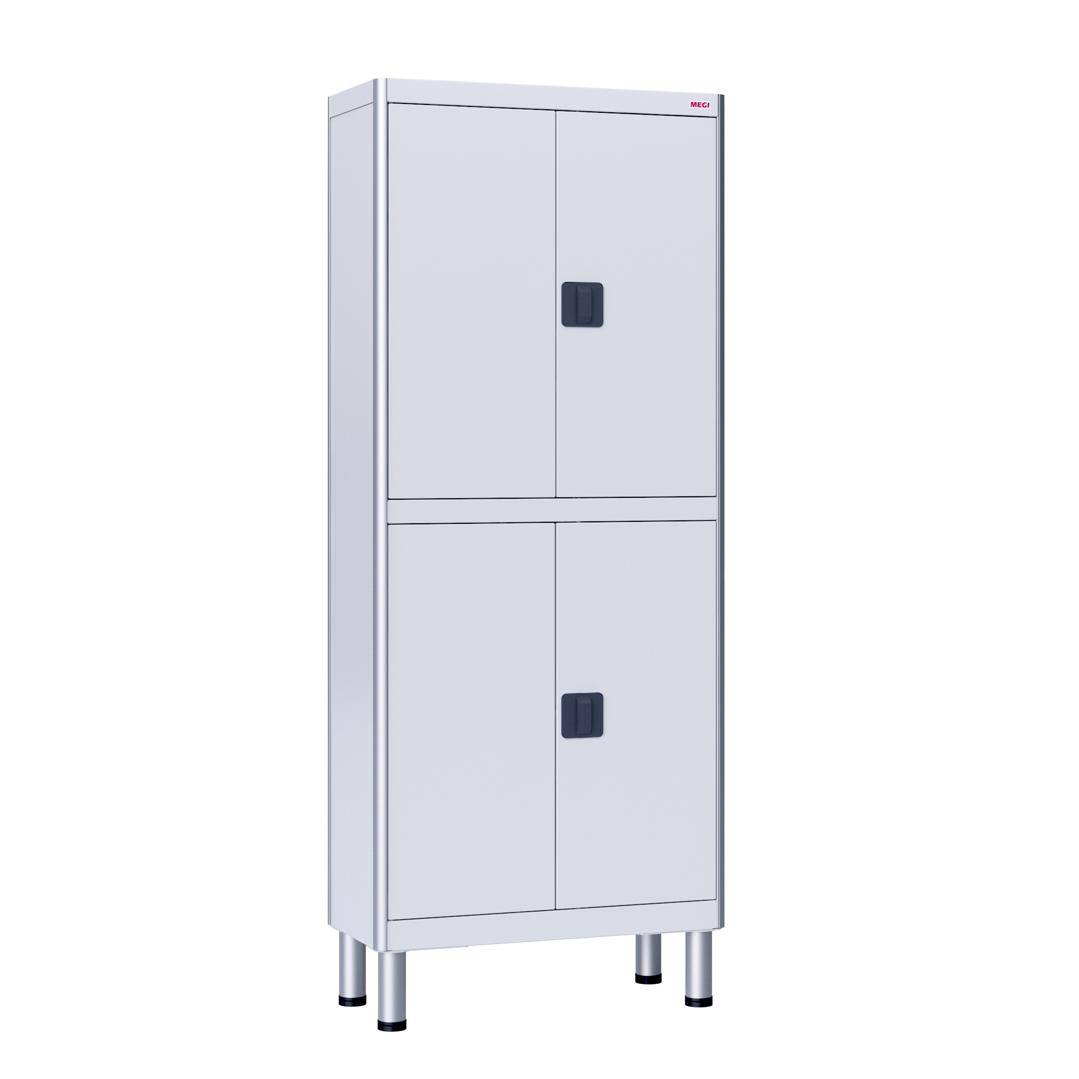 Двери металлические оснащены вертикальным П-образным усилителем, придающим им жесткость. Сварные петли дверей вставляются в отверстия в горизонтальных коробах при сборке шкафа, а наличие втулок из ПВХ исключает люфт и смягчают работу дверей. Двери снабжены врезными ригельными замками с поворотной ручкой и комплектом ключей.