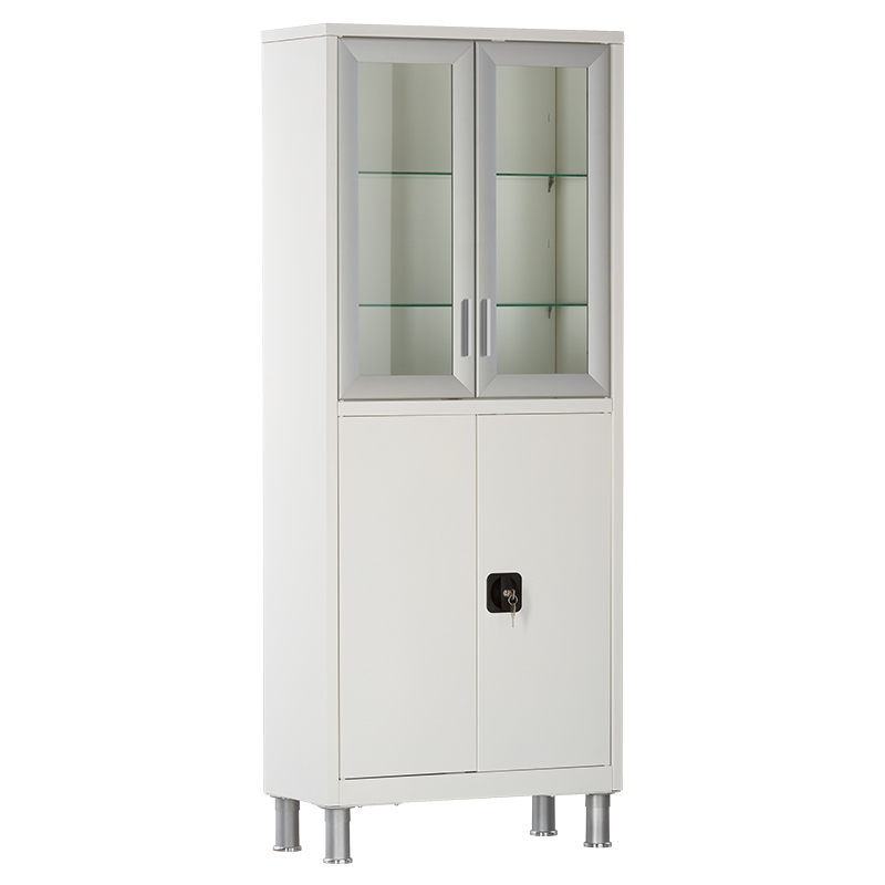Нижняя секция имеет две двери металлические с вертикальным П-образным усилителем, придающим им жесткость. Оси дверей вставляются в отверстия в горизонтальных коробах при сборке шкафа, а наличие втулок из ПВХ исключает люфт и смягчают работу дверей. Правая дверь снабжена врезным ригельным замком с поворотной ручкой и комплектом ключей, а левая комплектуется магнитной защёлкой. Две полки металлические устанавливаются на удобную для эксплуатации высоту.