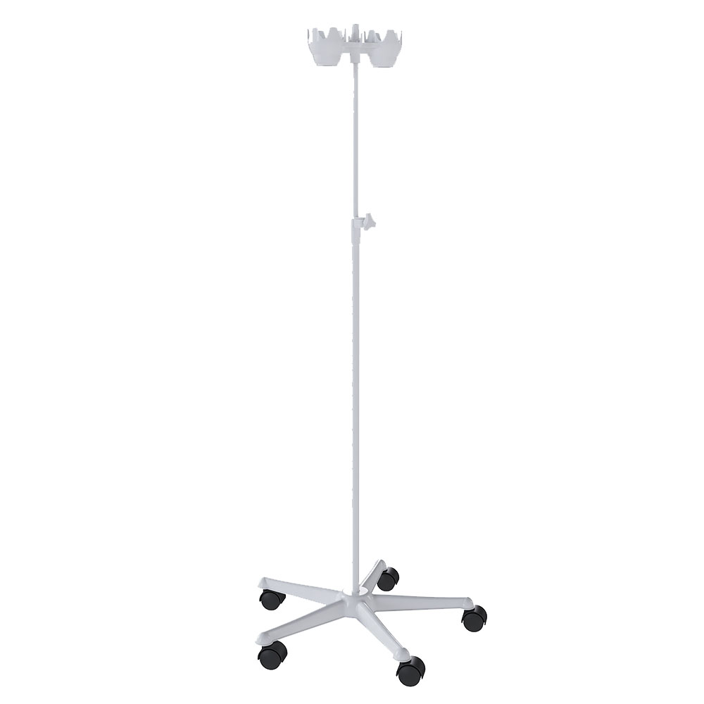 Телескопическое устройство стойки позволяет регулировать высоту от 1200 до 2100 мм. Пятиопорное основание установлено на пластиковые самоориентирующииеся колеса ∅50 мм, два колеса – с индивидуальным тормозным устройством.