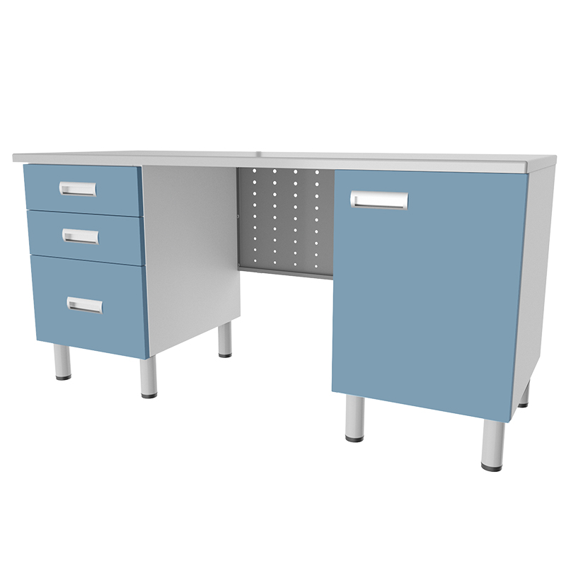 Стол лабораторный с двумя тумбами, дверками и полкой, предназначен для организации рабочего места лаборанта, размещения оборудования и приборов, проведения химических и физических исследований. Стол имеет жесткую модульную сборно-разборную конструкцию, изготовленную из листовой стали...